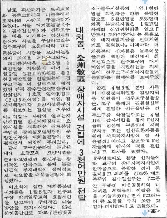 이전글 다음글 목록 SNS 공유하기 1986년 04월 27일자 제1503호 대치동, 전주교구 장애자시설 건립에 3천여만원 전달 페이지 정보 작성일2009-07-10 조회 2,510회 본문
