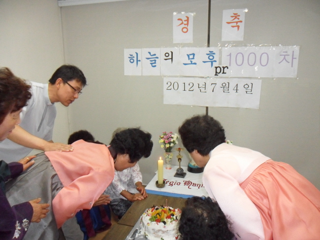 지난 7월 4일(수) 만경 성당(주임=양승욱 신부) 성모성심 꾸리아(단장=최순녀)직속 하늘의 모후 쁘레시디움(단장=최선임) 1000차 주회합을 유아실에서 가진 후 레지오 단원들과 교형자매가 함께 기쁨을 나누며 나눔의 잔치를 가졌다.