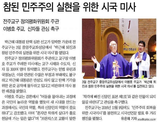 이전글 다음글 목록 SNS 공유하기 참된 민주주의 실현을 위한 시국 미사[가톨릭평화신문 2017-03-12] 페이지 정보 작성자 하비에르 작성일17-04-27 09:13 조회5,186회 댓글0건 관련링크 본문 * 이미지를 클릭하시면 크게 보실 수 있습니다. 이전글 다음글 목록