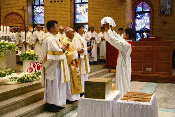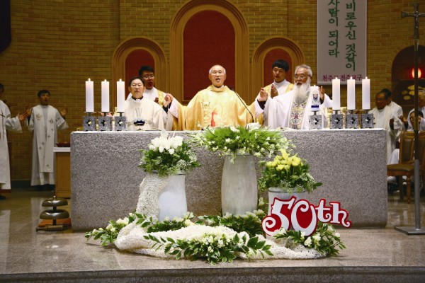 3월 24일(목)주교좌 중앙 성당에서 이병호 주교 주례로 성유축성미사를 봉헌한 후 사제 수품 50주년을 맞은 이수현(보나벤뚜라)신부와 문정현(바르톨로메오)신부 금경축 행사를 거행했다.