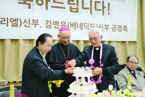 두 분 신부님의 축하식은 김영수 총대리 신부의 약력 소개를 시작으로, 여성연합회의 꽃다발 증정, 교구 사제단과 평신도단체협의회에서 준비한 예물 증정이 있었다. 이영우 신부(=교구 사제단친목회장), 한귀석 형제(평신도협의회장), 이병호 주교의 축사가 이어졌다.