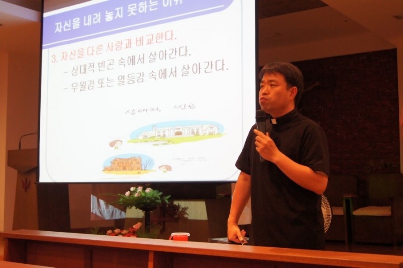문정 성당(주임= 신원철 신부)은 지난 9월 3일(화) 영화 레미제라블을 감상하며 사랑과 용서, 구원과 희망을 묵상하고, 9월 4일(수)은 이금재 신부(가정사목국장)를 초청하여, “나를 내려놓자” 라는 주제의 강의를 들었다. 이금재 신부는 “마음, 생각, 욕심.등 나쁜 것이든 좋은 것이든 다 내려놓아야 한다”며 “신앙인들은 봉헌하는 삶, 성장하는 삶, 해석하는 삶, 떠나는 삶, 십자가의 삶”을 살아야한다고 강조했다.