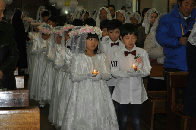 장수 성당(주임=정동수 신부)은 지난 12월 15일(주일) 교중미사 중에 다문화 가정 자녀 3명을 포함한 17명의 어린이들의 첫영성체가 있었다. 아이들은 3주간의 교리교육과 마르코복음 성서 쓰기를 마쳤고, 미사 중에 천사와 같은 모습으로 부모님과 함께 입장하여 예수님의 몸과 피를 모시는 기쁨을 누렸다. 특히, 미사를 공동 집전한 김창신 신부(이주사목 국장)는 다문화 가정의 아이들이 예수님 안에 함께 할수 있게 해주어 감사하다는 인사를 전했다.