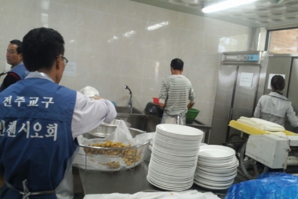지난 10월 27일(주일) 성 빈첸시오 아 바오로회 전주교구이사회 찾아가는 나눔 봉사팀과 전주교구 군종후원회 17명은 청주공항 제17전투비행단내 천성대 성당(주임=전주교구 소속 송형석 신부) 장병을 위문하고 격려하기 위하여 방문 짜장면과 탕수육을 현장에서 조리하여 100여명의 신자장병과 일반장병 150여 명과 군인 가족 50여에게 점심으로 제공했다.