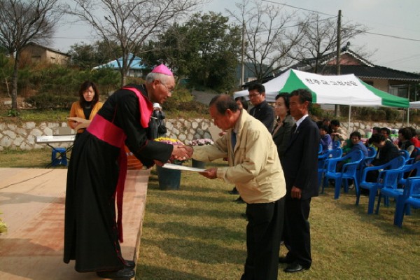 고창 본당(주임= 조정오 신부) 동혜원 공소는 지난 10월 24일(목) 한센인 정착마을 한마음 축제를 갖고 그동안 기도와 후원을 아끼지 않은 은인들과 함께하는 시간을 가졌다. 공소 야외 마당에서 펼쳐진 이날 행사에는 교구장 이병호 주교와 남종기 사회 사목국장신부, 김제 신암, 함열 상지원 등 5개 정착마을 공소 교우들과 지역 인사, 후원자 등 300여 명이 함께했다. 미사를 집전한 이주교는 1967년 이태리에서 이곳에 와 지금까지 소임하고 있는 나옥선 수녀(작은 자매 관상 선교회)를 보면서 “외국인으로 젊음을 이곳에서 바친 수녀님을 통해 하느님 사랑이 얼마나 위대한가를 깨닫는다.”며 “이들은 장차 들어 갈 영원한 나라를 바라며 사는 자들”이라고 치하했다. 이날 신앙체험 나눔 시간에 백영자(아네스)자매는 지금은 고인이 된 한센인 남편과의 힘든 삶을 예수님 사랑을 통해 극복한 체험을 들려줬다. 이 주교는 한센인들을 위해 봉사해온 월명동 본당 애령회와 공소에 스테인 글라스를 설치하고, 교우들에게 도자기 기술을 가르쳐온 ‘놀자 재능기부회’(지도=김봉술 신부) 그리고 한센인 복지증진에 앞장서온 지역 인사들에게 감사장을 전달했다. 마당에는 공소신자들이 만든 도자기 작품들이 전시되어 눈길을 끌었다. 행사에 이어 잔디밭에서 다함께 오찬을 나누고 오후에는 정착 마을 주민들과 은인들이 어우러진 흥겨운 한마당으로 모두가 하나 되는 시간을 가졌다.