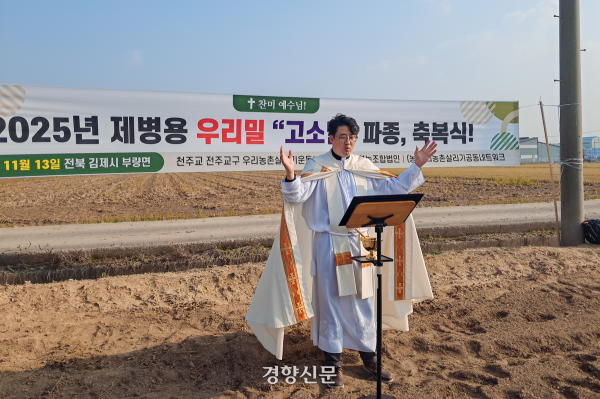 전국 최대 곡창지대인 전북 김제. 지난 13일 부량면에선 이색적인 예식이 거행됐다. 제병을 만드는데 사용될 전용 밀을 파종하고 이를 기념하며 축복하는 ‘밀밭 축복식’. 직접 농사를 짓는 한마음 영농조합 장수용 대표와 도정·제분 등 제병을 만들기 위해 필요한 과정을 전담하는 우리농촌살리기공동네트워크 심상준 대표 등 10여명의 관계자들이 모였다.