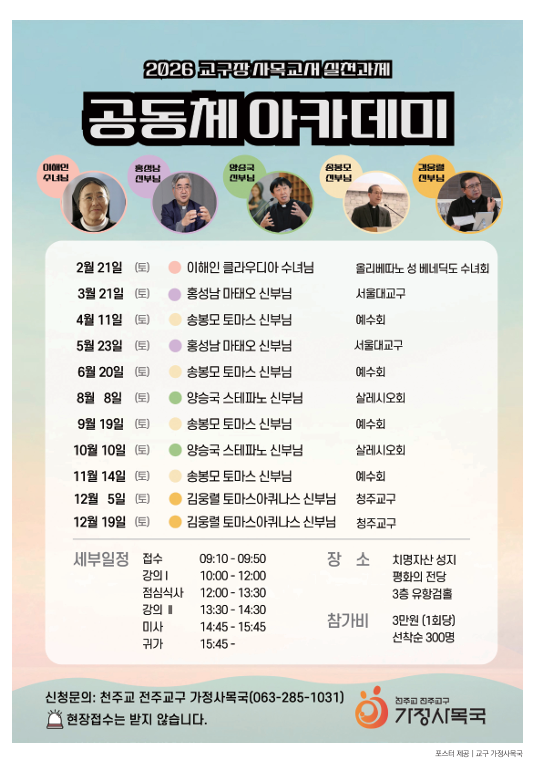 공동체 아카데미는 2월부터 12월까지 매월 지정된 토요일에 열리며 치명자산성지 평화의 전당 3층 유항검홀에서 진행되고, 참가비는 회차당 1인 3만원이며, 원활한 진행을 위해 회차별 선착순 300명으로 제한되고, 현장 접수는 받지 않는다.