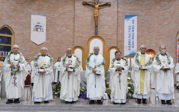 이어서 사제 수품 50주년을 맞은 김병환 신부, 문규현 신부, 전대복 신부, 왕수해 신부, 나궁열 신부, 한기호 신부, 성태수 신부, 김태윤 신부를 위한 금경축 축하식이 열렸다. 여성연합회(회장=김미자 실비아)가 준비한 꽃목걸이를 걸고 제단에 선 원로 사제들에게 회중은 큰 박수와 환호를 보냈다.
