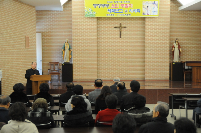 PBC 평화 방송에서 제작한 “동정부부 요안 루갈다”의 드라마 제작 보고 및 시사회가 지난 11월 26일(금) 오후 2시에 교구청 4층 강당에서 있었다. 한국 교회의 자랑이며 영적 등불인 동정부부 순교자 요안 루갈다와 유항검 가족의 순교신앙을 담은 순교사극 “동정부부 요안 루갈다”는 순교자 현양운동의 일환으로 전주교구의 후원으로 특별 기획 제작되었다. 이날 시사회에는 드라마에 출연한 연기자 배우들과 제작진들이 함께 참석하였으며, 평화방송 김수형 감독의 제작보고가 있었다.