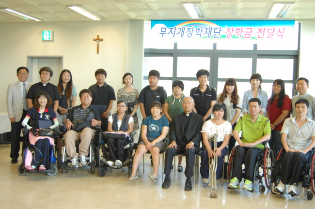 지난 8월 27일(토) 오후 3시 교구청 4층에서 황인재 학생 외 24명에게 무지개장학재단 장학금 전달식을 가졌다. 무지개 장학금은 전북지역에 거주하는 장애인 학생이거나 장애인 부모의 자녀에게 지급되며 고등학생과 대학생을 대상으로 실납부금액을 지원하는 형식으로 이루어진다. 2007년 2월에 첫 장학금이 전달된 이래로 지금까지 이어져온 이 장학재단은 지금까지 10회에 걸쳐 고등학생 67명, 대학생 175명, 대학원생 2명에게 장학금을 전달했다. 이날 장학금을 전달한 교구장 이병호 주교는 “세상에 도움을 줄 수 없을 만큼 가난한 사람도 없고, 어떤 도움도 필요하지 않을만큼 부자인 사람도 없을 것”이라고 말하며 이는 이 세상이 혼자서는 살아갈 수 없는 곳임을 말해주는 것 이라고 했다. 또한 “누군가에게 사랑을 전하면 그 사랑은 살아남아 있게 되는데, 이 사랑을 잊지말고 하느님의 인도대로 잘 살아가는 여러분이 되기를 바란다.”고 당부했다. 무지개 장학재단은 지정환 신부님이 호암상으로 받은 상금과 임실치즈농협에서 매달 보내온 기금과 지정환임실치즈피자 판매수익금을 모아 설립했다.