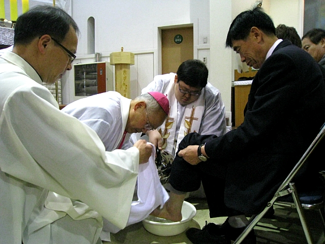 지난 4월 5일(목) 오후 8시에 효자동 성당(주임=김기곤 신부)에서 교구장 이병호 주교 집전으로 ‘주님의 만찬 미사’를 봉헌했다. 이병호 주교는 “이것은 내 피로 맺는 새로운 계약의 잔이니 마실 때마다 나를 기억하여 이 예를 행하여라.”(1코린 11,24)라는 성경말씀을 전하며 “이스라엘의 과월절 축제가 성체성사의 원형이 되는 말씀이다. 과월절의 희생제물인 양, 염소가 아닌 예수님 자신이 어린양이 되신 것이다. 예수님께서는 수난하시기 전날 제자들과 함께 마지막 만찬 중에 빵과 포도주의 형상 안에 성체성사를 제정하셨다. 주님이 다시 오실 때까지 내가 너희를 사랑한 것처럼 너희도 서로 사랑하여라. 이것이 새 계명이다.”라고 말하며 제자들의 발을 몸소 씻어 주신 것 같이 12명에게 사랑과 겸손의 상징인 발 씻김 예식을 거행했다.