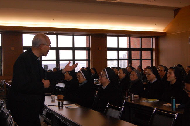 교구 수녀연합회 사목교서 연수_김동옥 기자 페이지 정보 작성일2013-03-04 이전글 다음글 목록 본문 교구 수녀연합회는 지난 2월 26일(화) 교구청 4층 강당에서 2월 월례회의를 가졌다. 오전 9시부터 시작된 이날 모임은 고해성사와 말씀의 전례시간을 가진 후 교구장 이병호 주교를 모시고 ‘신앙의 해-말씀 안에서 믿음을’이라는 주제로 강의를 들었다. 점심 식사 후에는 교구 수녀연합회 지구장, 임원 모임도 이어졌다.