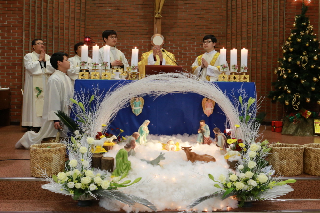 예수성탄 대축일 낮미사_정남현 기자 페이지 정보 작성일2014-02-04 이전글 다음글 목록 본문 지난 12월 25일(수) 인후동 성당(주임=범영배 신부)에서 이병호 주교 주례로 예수성탄 대축일 낮미사를 봉헌했다. 이날 이병호 주교는 강론에서 “우리 가운데 언제나 살아 있는 말씀을 믿고 실천하고 전하는 신앙생활을 해나가자”고 당부했다. 이어 성경을 필사한 일곱명에게 필사증을 수여했다.