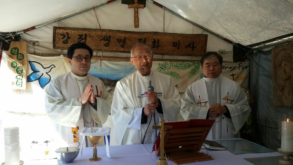 교구장 이병호 주교는 주교회의 소공동체위원회 회의 일정을 마치고 1월 30일(금) 오전 11시에 행정 대집행을 앞두고 있는 제주도 강정마을을 방문해 주님께서 창조하신 소중한 자연을 지키기 위해 애쓰는 사람들을 위로하고 문정현 신부(교구 원로사목자)를 격려했다. 이병호 주교는 미사를 함께 봉헌하며 “아브라함처럼 우리는 늘 우리의 체온이 남아 있는 이 자리를 떠나는 존재이다. 예수님께서도 배를 따고 건너편으로 가셨다. 그렇게 늘 걸어오던 문정현 신부가 좋은 예를 보여 준다. 그리고 그런 태도가 마르코 복음의 마지막 말씀처럼 ‘예수님께서 우리와 함께 계시며 그분의 말씀이 참되다’는 것을 생생하게 확인할 수 있게 해준다.”고 말했다.