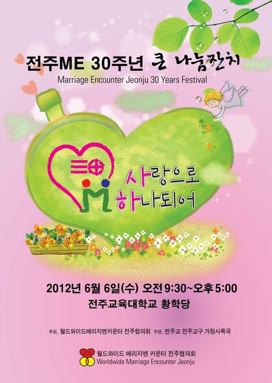6월 6일, 드디어 전주ME 30주년 기념행사의 성대한 막을 올립니다. 하느님 보시기에 참 좋은 부부의 삶을 살아가기 위해 노력하시는 부부님들의 모임인 이 날 행사를 위하여 각 본당에서 추진중인 티켓배부와 장기자랑 및 사진컨테스트..등 바쁜 일정을 소화하고 계실 전주 ME 식구들의 노력과 땀방울을 응원합니다.